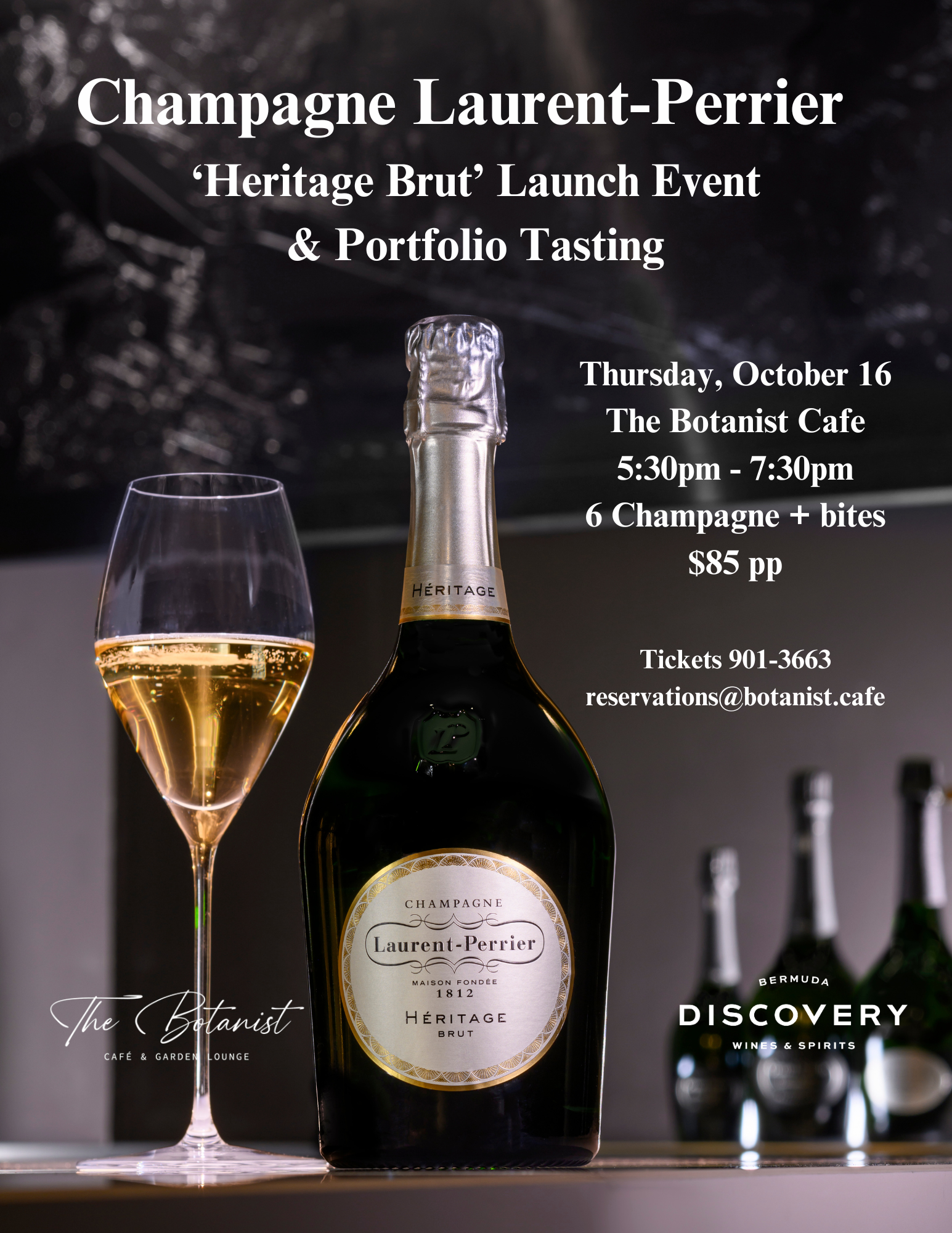 Join Discovery Wines & Spirits for an early evening exploration of Champagne Lauren-Perrier’s portfolio and the launch of their new premium expression ‘Heritage Brut’, now available in Bermuda. Served in the Rose Garden area of The Botanist Cafe in the Botanical Gardens.